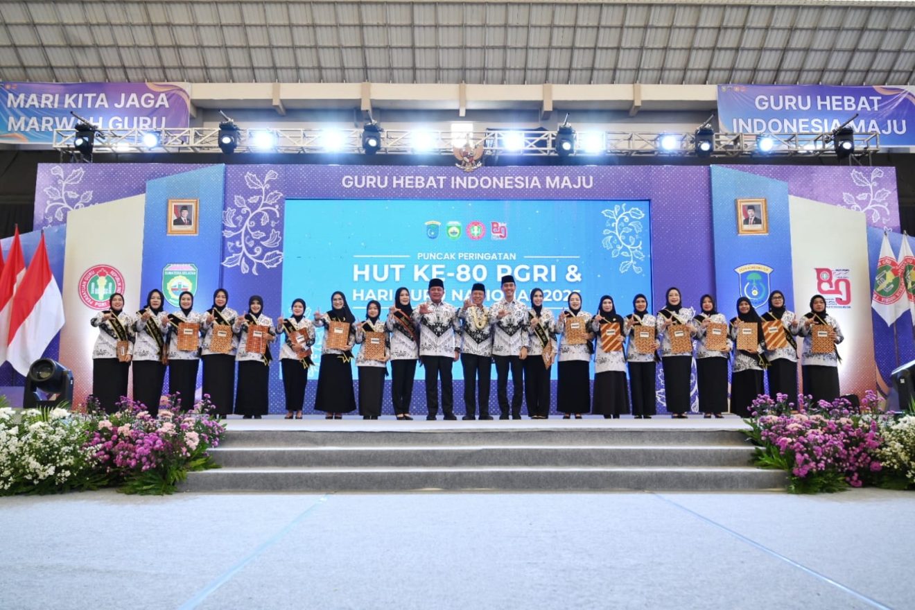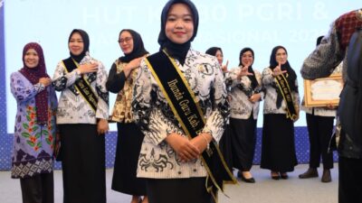 WartaDemokrasi – OKI — Dalam Acara Puncak Peringatan Hari Ulang Tahun (HUT) Persatuan Guru Republik Indonesia (PGRI) ke-80 tahun tingkat Provinsi Sumatera Selatan, Ketua Tim Penggerak PKK Kabupaten Banyuasin, Nabila Askolani Putri dikukuhkan sebagai Ibunda Guru Kabupaten Banyuasin digelar di Gedung Perahu Kajang Kayu Agung, Kabupaten Ogan Komering Ilir, Selasa (2/12/2025).