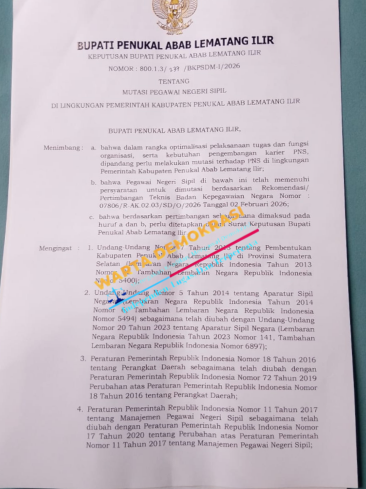 WARTADEMOKRASI , PALI – Kebijakan mutasi Aparatur Sipil Negara (ASN) di lingkungan Pemerintah Kabupaten Penukal Abab Lematang Ilir (PALI) menuai sorotan serius. Mutasi terhadap seorang guru sekolah dasar dinilai tidak transparan dan memunculkan dugaan adanya kejanggalan dalam proses penataan kepegawaian.