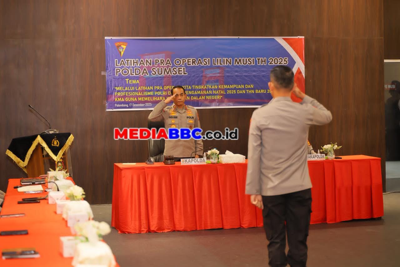 MEDIA BBC.co.id, Palembang — Kepolisian Daerah Sumatera Selatan menggelar Latihan Pra Operasi (Latpraops) Lilin Musi 2025 sebagai langkah awal kesiapan pengamanan perayaan Natal 2025 dan Tahun Baru 2026. Kegiatan tersebut dibuka secara resmi oleh Kapolda Sumsel Irjen Pol. Andi Rian R. Djajadi, S.I.K., M.H., bertempat di Lounge Ampera Lantai 7 Gedung Presisi Polda Sumsel, Palembang, Selasa (17/12/2025).