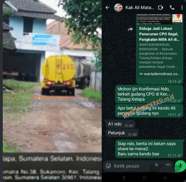 WARTADEMOKRASI, BANYUASIN – Dugaan Praktik mafia kencing CPO di Jalan Lintas KM 14 terbongkar setelah terduga pengelola pangkalan, Ali, mengakui informasi aktivitas ilegal di lokasinya adalah “A1″ (Akurat/Valid). Pengakuan ini disampaikan Ali melalui pesan singkat kepada tim redaksi Warta Demokrasi pada Jumat malam (3/4/2026).