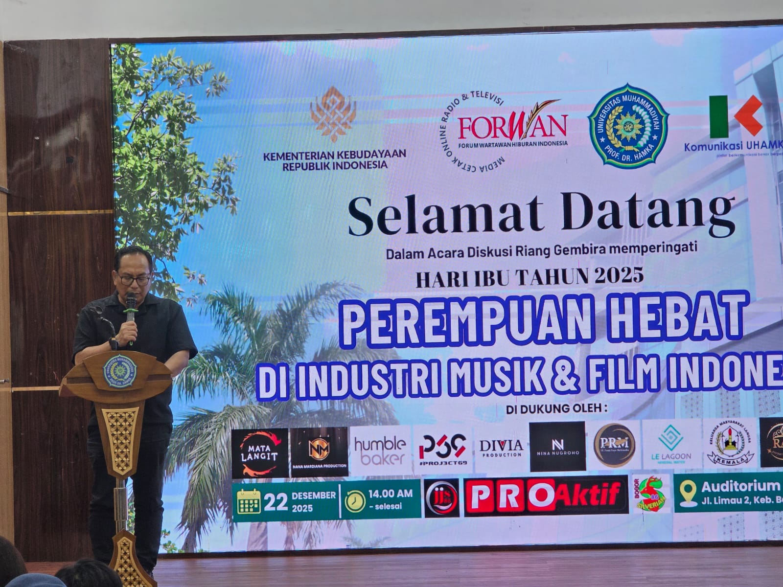 WartaDemokrasi – Jakarta — Diskusi Riang Gembira Perempuan Hebat di Industri Musik dan Film Indonesia resmi dibuka oleh Direktur Perfilman, Musik, dan Seni, Dr. Syaifullah Agam, di Aula Universitas Muhammadiyah Prof. Hamka (UHAMKA), Radio Dalam, Jakarta Selatan, Senin (22/12/2024).