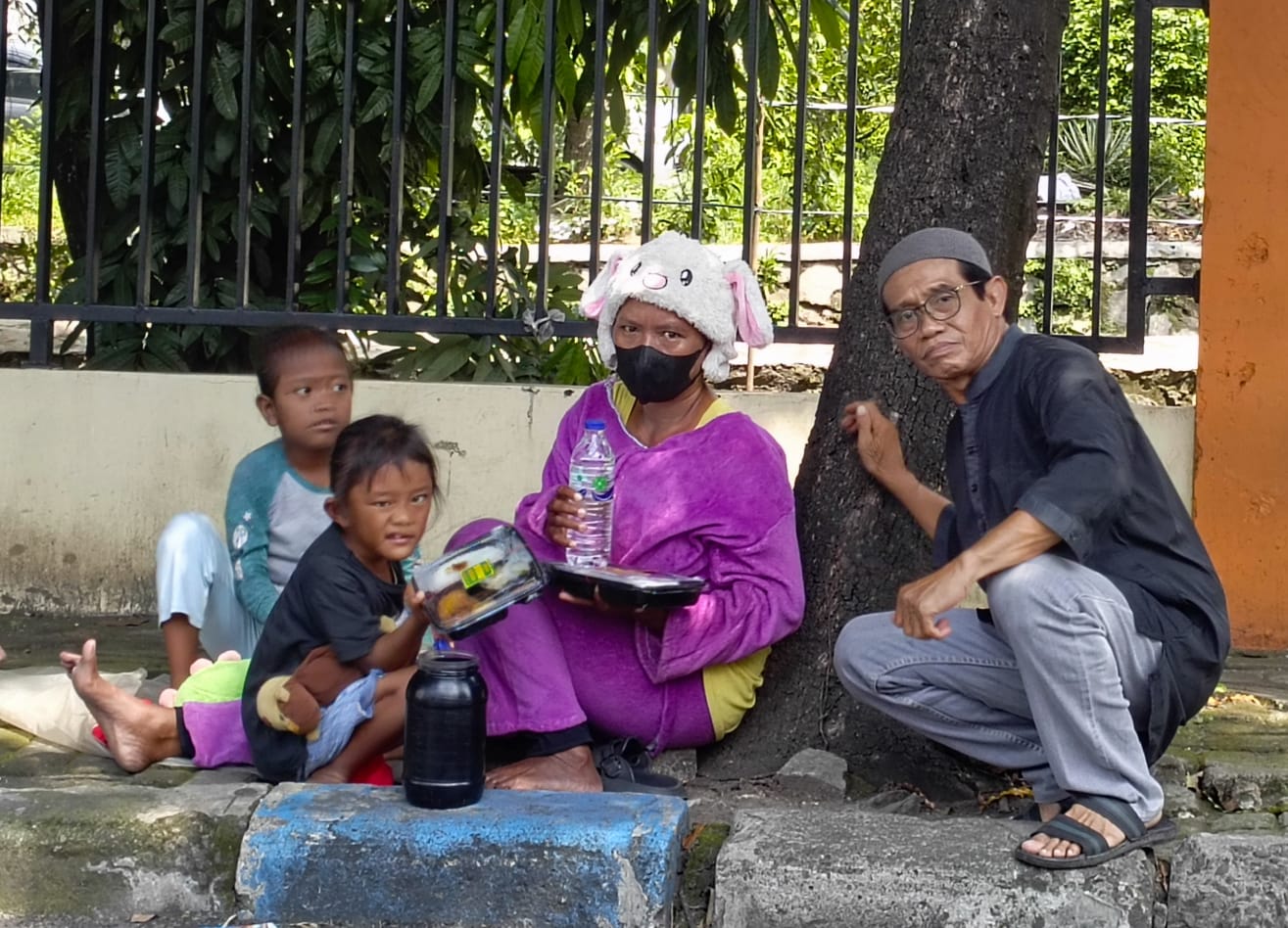 Lain lagi pemandangan yang terlihat ketika mau melewati Perumahaan Harapan Regency, Cakung, Jakarta Timur. Nampak duduk seorang ibu yang mengaku bernama Sarni (pengamen badut) bersama kedua anaknya, Zahara dan Putri. Raut wajahnya ceria saat menerima nasi boks dan air mineral botol dari Tim PJBW.