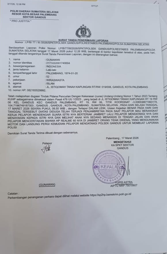 WARTADEMOKRASI, PALEMBANG — Penanganan kasus jambret terhadap bocah 5 tahun di Gandus membuka fakta yang mengundang tanda tanya besar. Saat keluarga korban melapor ke Polsek Gandus, mereka justru mendapat jawaban mencengangkan: tidak ada personel untuk melakukan penangkapan.